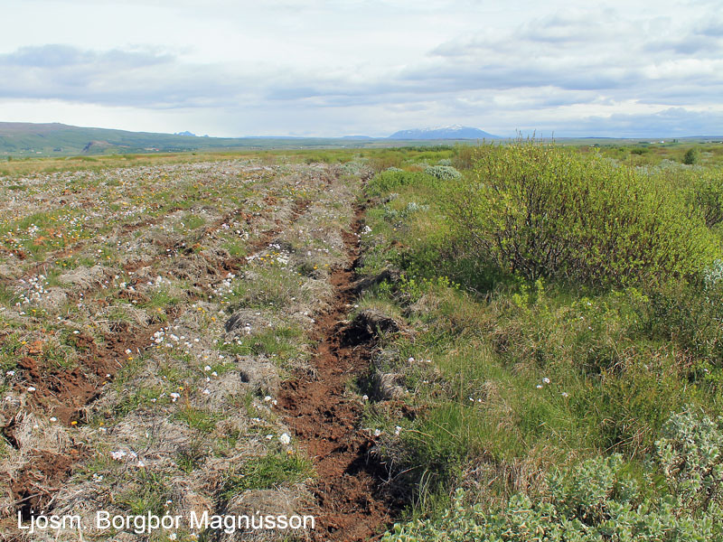 Land við Dagmálatjörn sem tekið hefur verið til skógræktar. Kjarr- og mýrlendisgróðri hefur verið eytt með plöntueitri og sitkagreni plantað í landið. Dauð birkihrísla er í forgrunni en loðvíðirinn hefur það betra. Ljósm. Borgþór Magnússon, 2. júlí 2013.