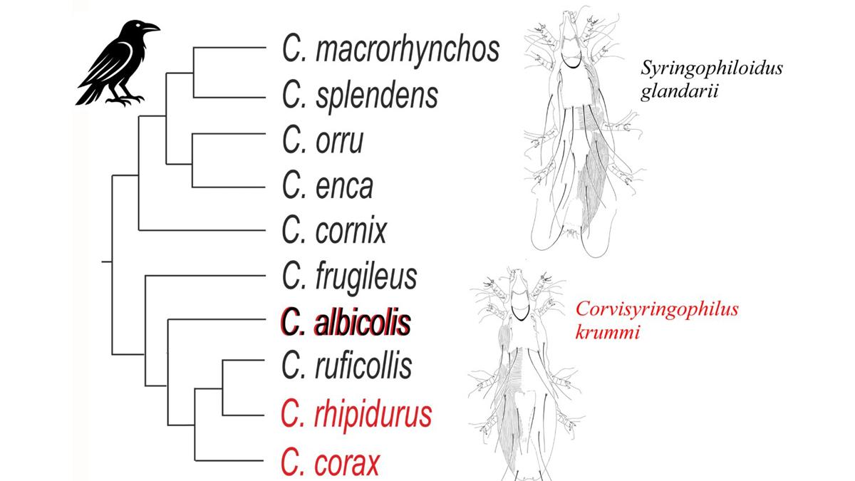 Í rannsókninni voru skoðaðir 179 fuglar af 19 tegundum af ættkvíslinni Corvus, en til þeirrar ættkvíslar teljast hrafnar og krákur. Fjaðurstafamítlar fundust í fjöðrum 31 fugls af 11 tegundum. Tvær mítlategundir komu þar við sögu, Syringophiloidus glandarii og Corvisyringophilus krummi, búsvæði þeirra á hýslinum var það sama og báðar fundust eingöngu í vængþökum.