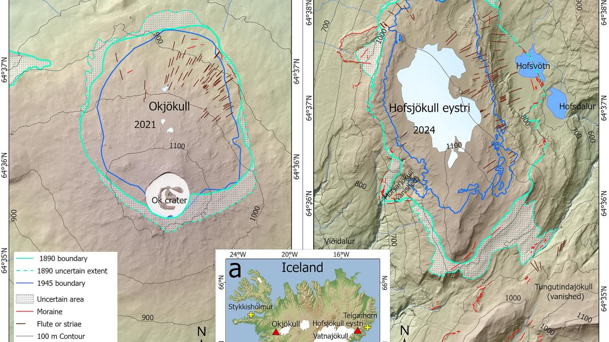 Í nýrri vísindagrein sem birtist í tímaritinu Annals of Glaciology er fjallað um þróun og rýrnun Hofsjökuls eystri og Okjökuls undanfarin 135 ár. Rannsóknin byggir á sögulegum gögnum, loftmyndum, gervihnattamyndum og stafrænum hæðarlíkönum sem varpa ljósi á breytingar á flatarmáli og rúmmáli jöklanna.
